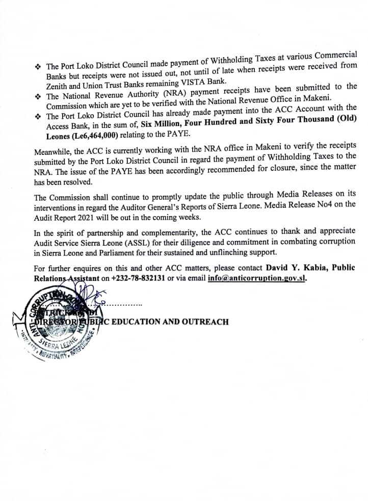 Meanwhile, the ACC is currently working with the NRA office in Makeni to verify the receipts submitted by the Port Loko District Council in regard the payment of Withholding Taxes to the NRA. The issue of the PAYE has been accordingly recommended for closure, since the matter has been resolved.