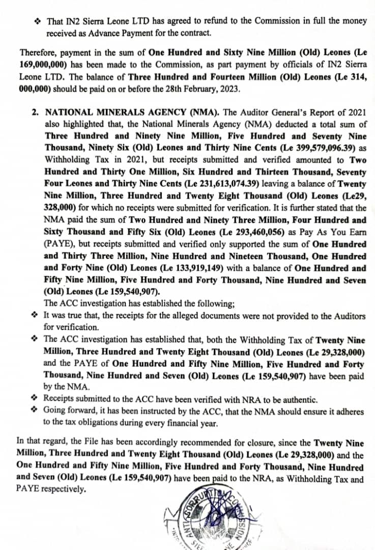 The ACC investigation has established that, both the Withholding Tax of Twenty Nine Million, Three Hundred and Twenty Eight Thousand (Old) Leones (Le 29,328,000) and the PAYE of One Hundred and Fifty Nine Million, Five Hundred and Forty Thousand, Nine Hundred and Seven (Old) Leones (Le 159,540,907) have been paid by the NMA.